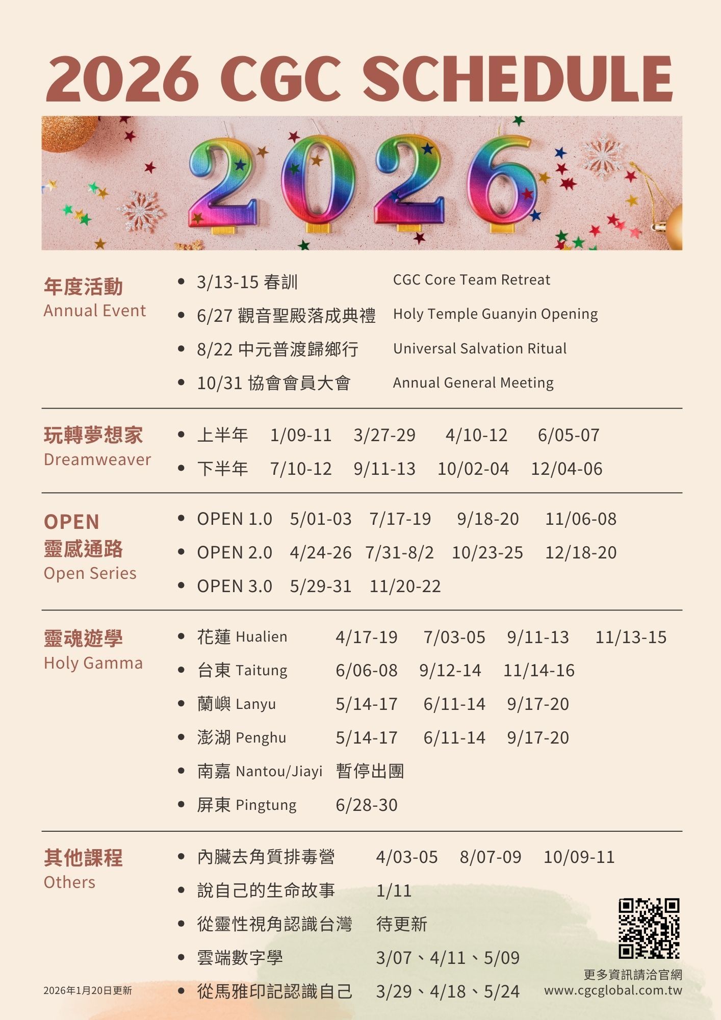 2026年將是馬不停蹄的一年,CGC旗下各單位(學院、基地、協會)也規劃了豐富的課程與活動,持續陪伴大家的學習成長,以及回歸生活中的實踐 —— 超前部署2026,大家把時間和預算提前規劃好哦,讓我們陪伴彼此,迎向嶄新的一年!