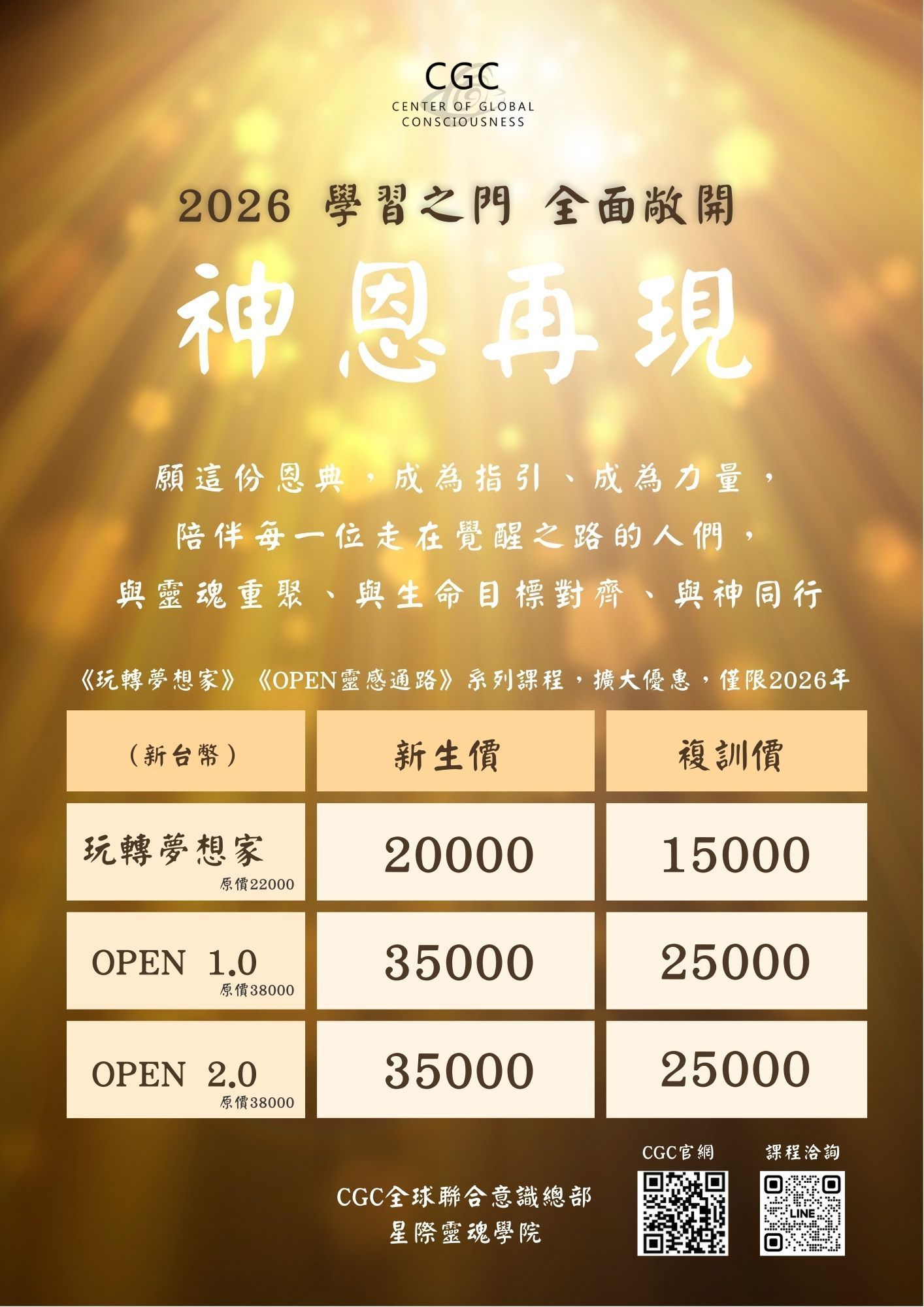 順應這股神聖能量的湧動,CGC星際靈魂學院將全面調整課程費用,讓這份恩典,成為指引、成為力量,陪伴每一位走在覺醒之路的人們—— 與靈魂重聚、與生命目標對齊、與神同行!