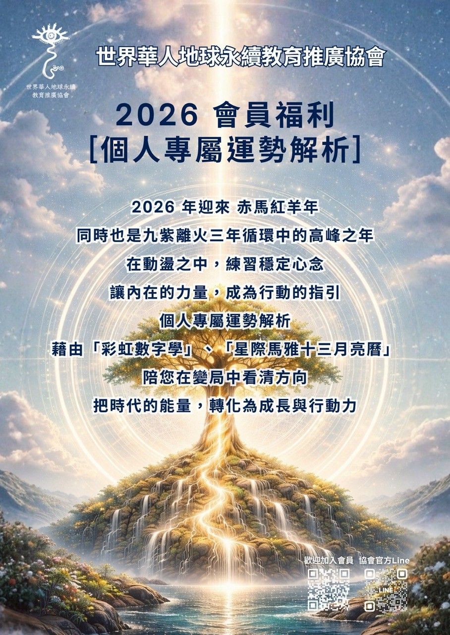 世界華人地球永續教育推廣協會,會員專屬福利【2026 個人專屬運勢解析】開始報名—— 2026「赤馬紅羊年」也是九紫離火三年循環的高峰之年,世界正式進入快速變動、全面轉化的頻率。動盪與變局之中,如何穩定心念、放慢腳步,讓內在的清明與力量,成為行動時的依靠呢?